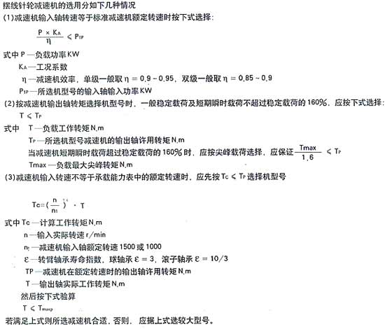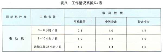 本系列擺線針輪減速機(jī)是在每日八小時(shí)單向連續(xù)運(yùn)轉(zhuǎn),載荷平穩(wěn)的條件下設(shè)計(jì)的,當(dāng)減速機(jī)實(shí)際工作時(shí)間和載荷性質(zhì)與上述設(shè)計(jì)條件不符時(shí),應(yīng)以工作情況系數(shù)KA進(jìn)行修正,KA值按表八確定。