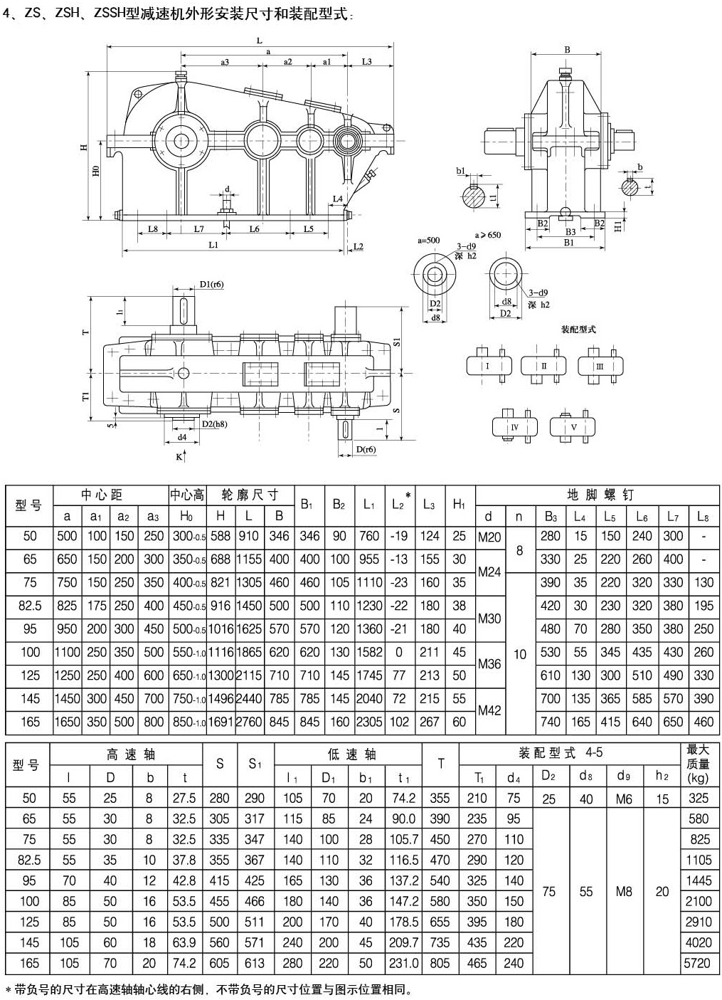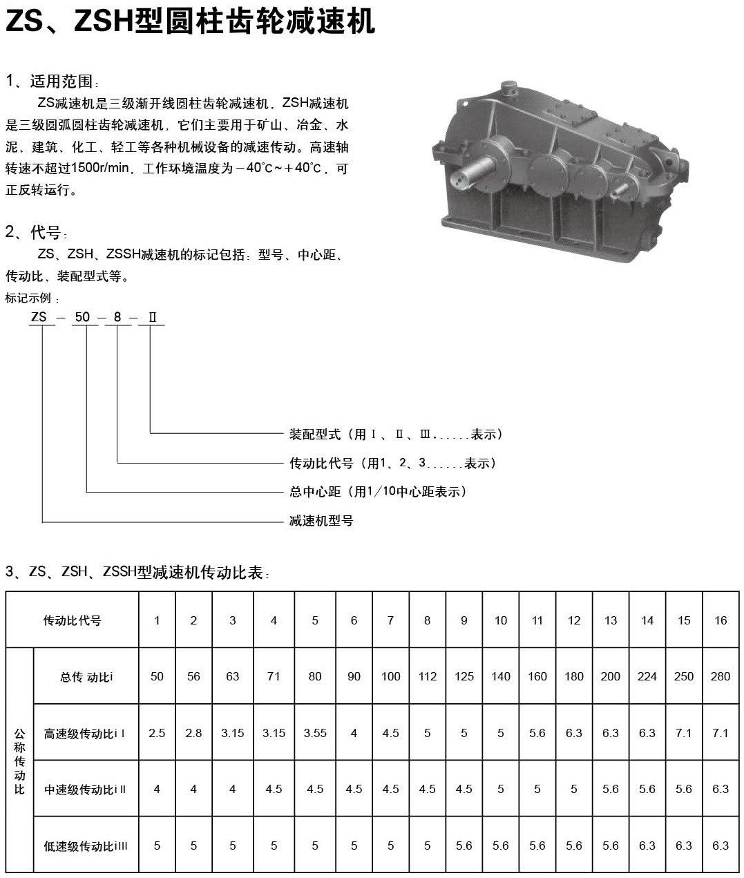 ZS,ZSH型減速機(jī)主要用于超重,礦山,通用化工,紡織,輕工等行業(yè),其適用條件如下:減速機(jī)齒輪傳動(dòng)圓周速度不大于4米/秒;高速軸的轉(zhuǎn)速不大于1500轉(zhuǎn)/分;用于正反兩向運(yùn)轉(zhuǎn);工作溫度為-40度至40度。九種傳動(dòng)比,九種配置形式和三種低速軸端型式。 型號(hào)標(biāo)記示例:ZS(ZSH) - 500-5- II ZS(ZSH)是減速機(jī)型號(hào),500是總中心距,5是傳動(dòng)比代號(hào),II裝配形式。